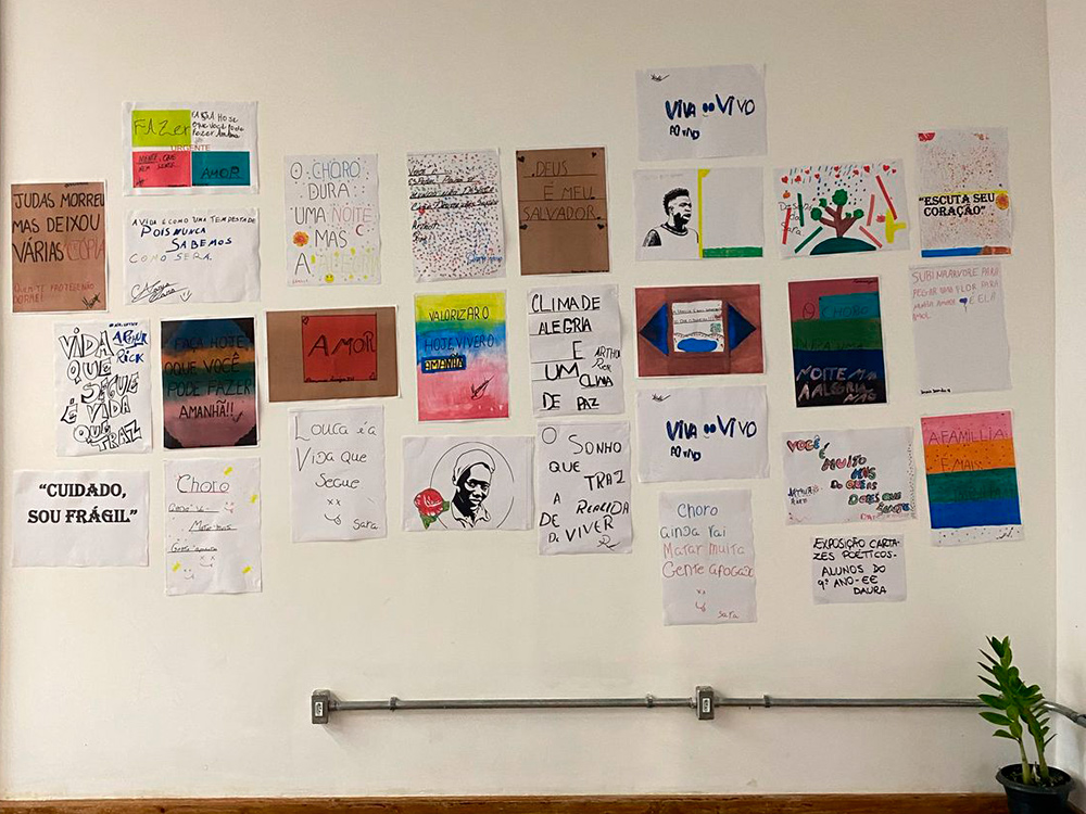 Para o professor da EE Profa Daura de Carvalho Neto Lucas Figueiredo dos Anjos, acompanhar as/os alunas/os nas oficinas foi interessante porque a experiência tirou da “zona de conforto” tanto as/os estudantes como ele, mas ao longo do processo todas/os foram se desenvolvendo. “Os estudantes tiveram uma oportunidade de se expressar de forma artística ‘fora’ do ambiente escolar em uma proposta que valorizou o que eles produziram, sendo assim vejo como um grande incentivo. Ao ver os cartazes expostos, me recordei do processo e senti a satisfação do desfecho.”
