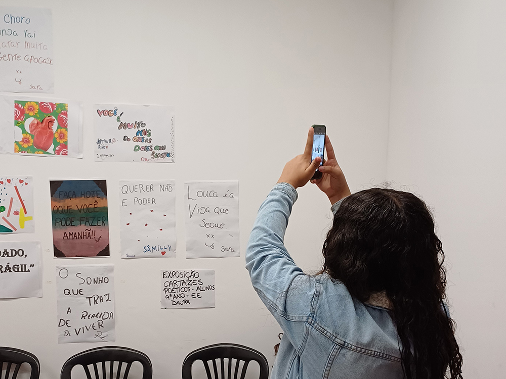 Já em agosto, o grupo se aproximou dos cartazes poéticos e começou a colocar a “mão na massa”. Elas/es também puderam apreciar a exposição da estudante Ana Júlia, que não era sobre cartazes poéticos, mas já estava no Centro Cultural. “Isso ajudou bastante na reflexão sobre o sentido de uma exposição: O que é? Qual o seu sentido? Que lugar o público ocupa na visita e interação com uma obra de arte? Assim a turma pôde entender melhor que viveriam algo parecido”, conta Juliana.